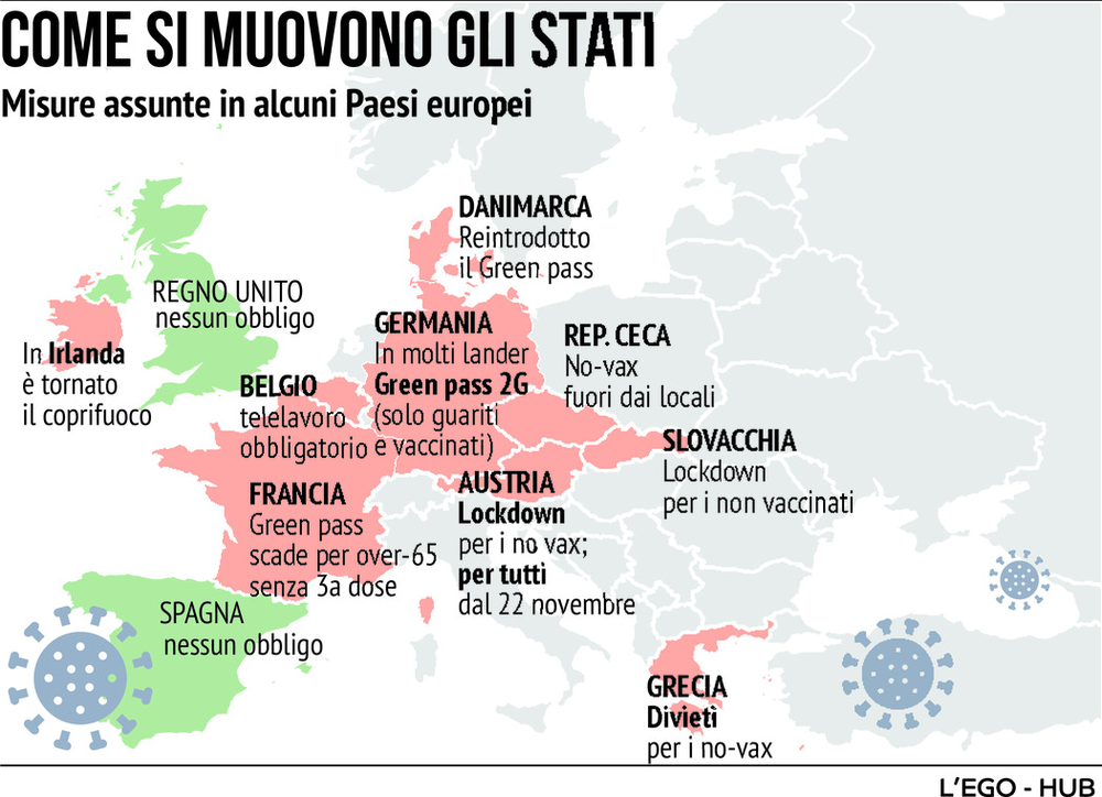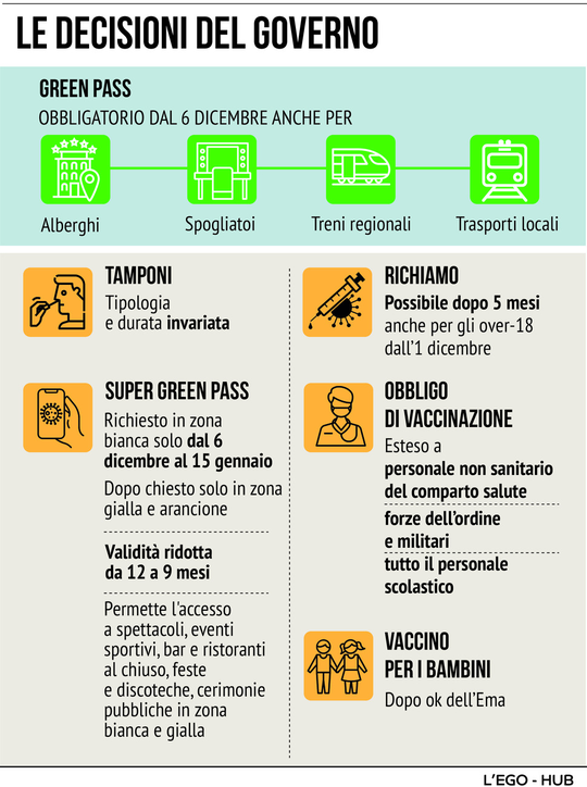 Dal 6 dicembre, però, il green pass “base” diventerà obbligatorio anche per usufruire di alberghi e spogliatoi per l’attività sportiva, ma anche per il trasporto ferroviario regionale e trasporto pubblico locale.