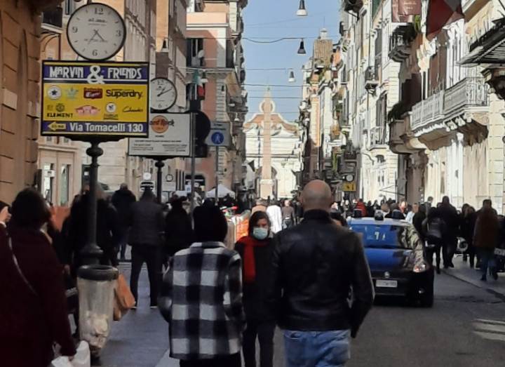 Nel Lazio sabato 30 gennaio è l’ultimo giorno di zona arancione, dopodiché da domenica 31 la regione torna a essere gialla. A Roma, via del Corso è la strada dello shopping e dello strùscio per antonomasia. La parola strùscio deriva dallo strusciare dei piedi sul fondo stradale o dallo strusciarsi delle persone tra loro, nell’affollamento delle passeggiate.